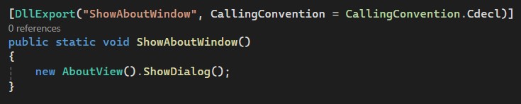 Initially, I installed UnmanagedExports by Robert Giesecke. It’s a pretty interesting and useful NuGet package that allows you to export methods from .NET assemblies as native DLL functions by adding specific DllExport attributes to the required methods. For example, here’s how the About window opening method and its attribute looked: