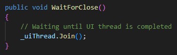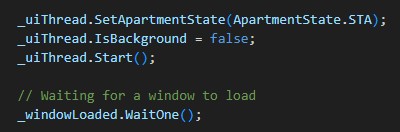 First of all, we set the apartment state to STA. WPF is based on DirectX and the Win32 API, both of which use COM. Many WPF UI components are COM objects, and therefore can operate only in STA mode. STA (Single-Threaded Apartment) is a threading model for COM objects where an object is bound to a single thread and all calls to it are marshaled through that thread`s message queue. The next line sets the IsBackground property to false. Because of this, the Python script will wait until the user closes the WPF window. Then we start the UI thread and, set the _windowLoaded AutoResetEvent to the non-signaled state, which means we will wait until the window is loaded.