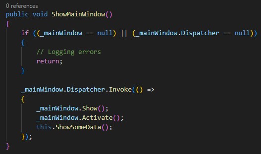 Let’s move on. Aside from the InitializeApplication method, there is also a ShowMainWindow method in the MyWpfAppWrapper class. First of all, it checks whether the main window or its dispatcher is null. If so, we should just return. Otherwise, we simply show the window, activate it, and call a business logic method. Note that this functionality belongs to the UI, so it must be called via the Dispatcher.