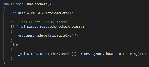 Business logic is introduced in the MyWpfAppWrapper class as a method that requests some data from the view model and displays this data in a MessageBox. Keep in mind that it must be called via the Dispatcher because this code interacts with UI components.