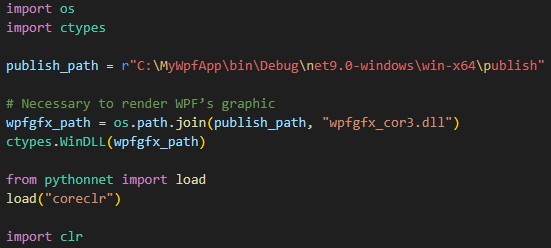 In the first two lines, we import modules for interacting with the operating system and for calling C libraries. The next few lines get more interesting. Here we explicitly load the wpfgfx_cor3.dll library. It is required for rendering WPF graphics. Without this step, you may get exception similar to the following one: