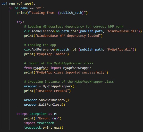 First of all, we check if the operating system is Windows. If so, we explicitly load the WindowsBase.dll, a core WPF infrastructure library that contains fundamental types and functionality required for Windows Presentation Foundation to work correctly when called from PythonNET. After that, we need to load the DLL that contains our app. Once it is loaded, we import the MyWpfAppWrapper class from the MyWpfApp module and create an instance of it. Now we have the ability to call its methods via their native signatures. It is also very important to call the WaitForClose method after all other UI methods. Otherwise, the app may be closed right after launch. The rest of the method is just an exception handler. The final part of the script is just a call to the run_wpf_app function: