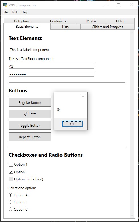 The user sees the message box because the ShowSomeData method displays it using data calculated in business logic of the view model. All the richness of WPF functionality is now available in the app, but you can also call methods directly if they are exposed by the MyWpfAppWrapper class.