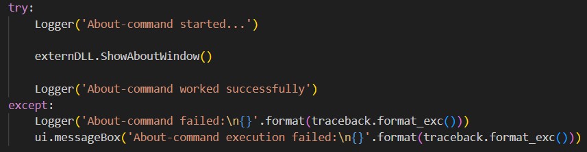 First of all, you might be wondering why I had to provide the ability to call individual methods. I could have just created a Python wrapper inside the CAD system and started a separate process that launches the entire WPF app from there, couldn’t I? Yes, I could. But according to the previously mentioned business requirements, I had to implement a dropdown menu through the CAD system’s scripting functionality, - meaning through Python. So each dropdown menu element (e.g. Authorize, About, etc.) called a distinct C# method.