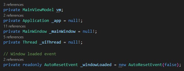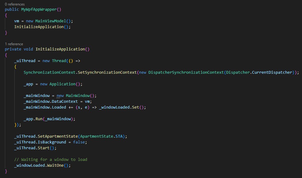 The first line creates and sets a DispatcherSynchronizationContext for the current thread, ensuring that all UI operations are executed on the correct thread. After that, we create a new application instance, create an instance of the main window, and set the view model as its data context. This logic should be clear to any WPF developer. _windowLoaded.Set(); handler is much more interesting. After the window loads, we call _windowLoaded.Set(), which puts the AutoResetEvent into a signaled state, allowing the waiting thread (the main thread) to pass through WaitOne() and continue execution. The event then automatically resets to non-signaled. And the final line starts the app with the main window. And let’s take a look at the rest of the method: